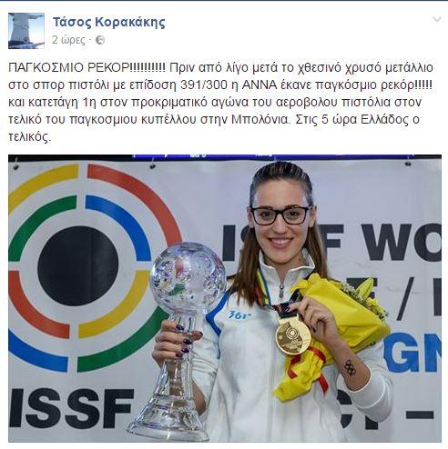 “ΠΑΓΚΟΣΜΙΟ ΡΕΚΟΡ!!!!!!!!!! Πριν από λίγο μετά το χθεσινό χρυσό μετάλλιο στο σπορ πιστόλι με επίδοση 391/300 η ΑΝΝΑ έκανε παγκόσμιο ρεκόρ!!!!! και κατετάγη 1η στον προκριματικό αγώνα του αεροβολου πιστόλια στον τελικό του παγκοσμίου κυπέλλου στην Μπολόνια. Στις 5 ώρα Ελλάδος ο τελικός”, έγραψε ο πατέρας της, Τάσος, στην σελίδα του στο Facebook.