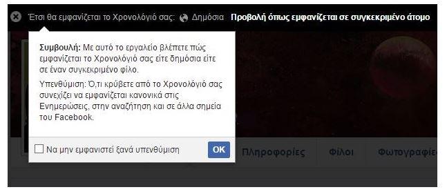 Τώρα μπορείτε να δείτε την δημόσια εκδοχή του προφίλ σας. Για να μάθετε τι βλέπουν συγκεκριμένοι φίλοι σας, επιλέξτε από τη μαύρη μπάρα επάνω “Προβολή όπως εμφανίζεται σε συγκεκριμένο άτομο” και στη συνέχεια πληκτρολογήστε το όνομα της επαφής που σας ενδιαφέρει.