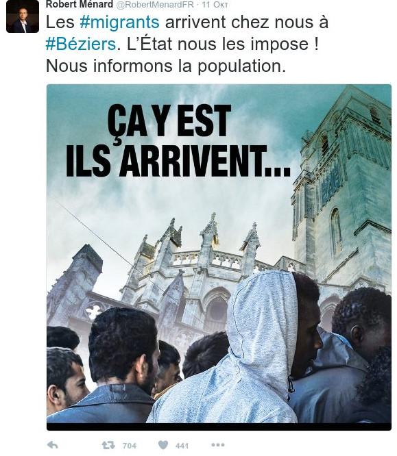 «Αυτό ήταν, έρχονται» γράφουν οι αφίσες. Στη φωτογραφία εμφανίζονται άνδρες μαύροι ή μελαμψοί, με γενειάδα ή με το κεφάλι καλυμμένο από μια κουκούλα, συγκεντρωμένοι μπροστά στον καθεδρικό ναό της Μπεζιέ. Ο δήμαρχος έγραψε μια λεζάντα που συνοδεύει την αφίσα:«Οι πρόσφυγες έρχονται στο Μπεζιέ μας. Το κράτος μας τους επιβάλλει. Ενημερώνουμε τον πληθυσμό».