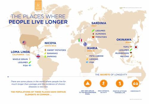 Ποια είναι αυτά τα πέντε μέρη και τι τρώνε οι κάτοικοί τους; Το ένα είναι το χωριό Λόμα Λίντα στην Καλιφόρνια όπου η τοπική δίαιτα βασίζεται στα δημητριακά ολικής άλεσης, τα όσπρια και τα λαχανικά καθώς και το ψάρι. Το άλλο είναι η χερσόνησος Νικόγια στην Κόστα Ρίκα (γλυκοπατάτες, μπανάνες και παπάγια). Ακόμη, η Σαρδηνία στην Ιταλία (όσπρια, αμύγδαλα, ντομάτα) και η Οκινάουα στην Ιαπωνία (τόφου, όσπρια, μανιτάρια, πεπόνι). Και φυσικά η Ικαρία όπου η δίαιτα περιλαμβάνει πολλή φέτα, λεμόνι και ψάρι.