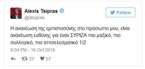 «Η ανανέωση της εμπιστοσύνης στο πρόσωπο μου, είναι ανανέωση ευθύνης για έναν ΣΥΡΙΖΑ πιο μαζικό, πιο συλλογικό, πιο αποτελεσματικό στις δύσκολες μάχες που μας περιμένουν, για μια Ελλάδα της δικαιοσύνης και της προκοπής».