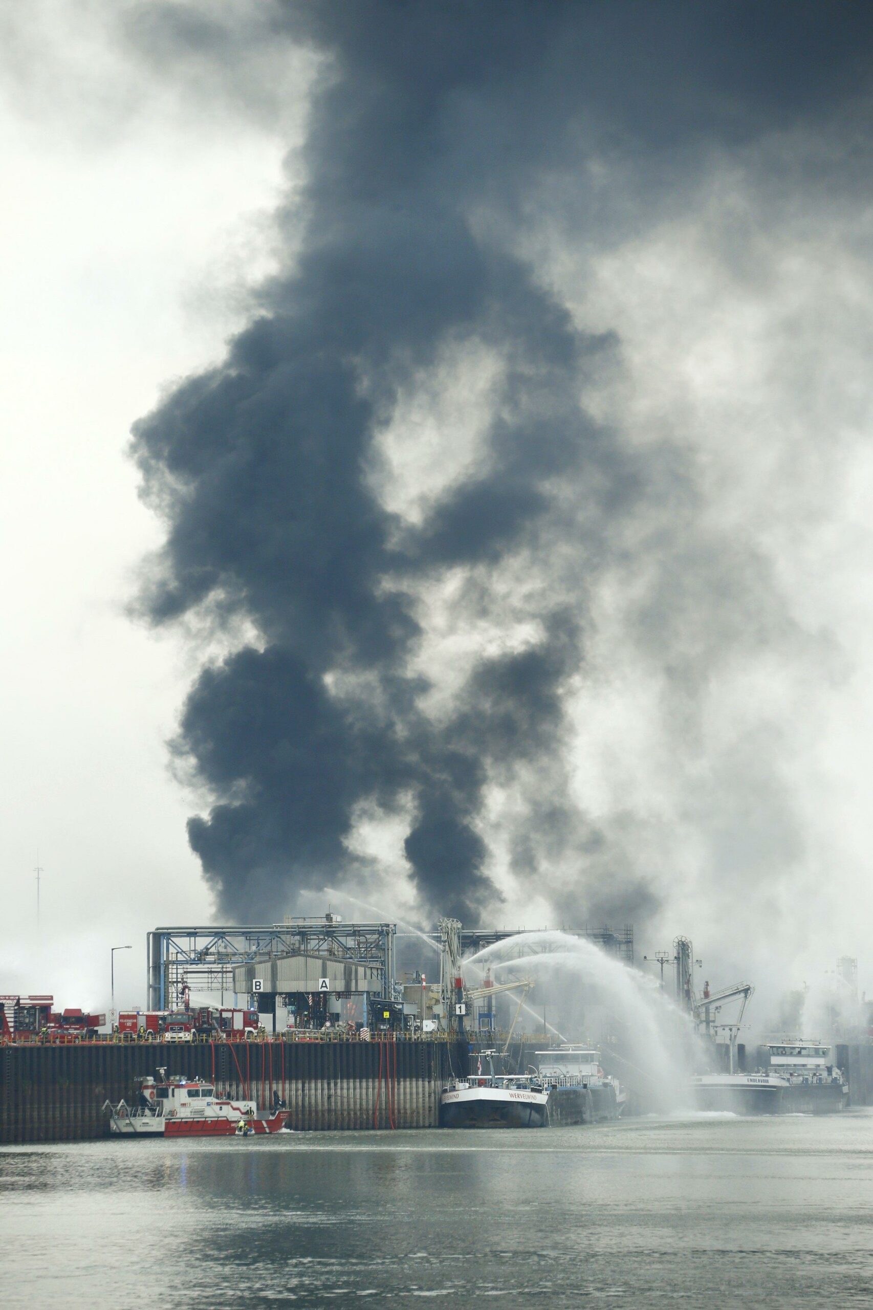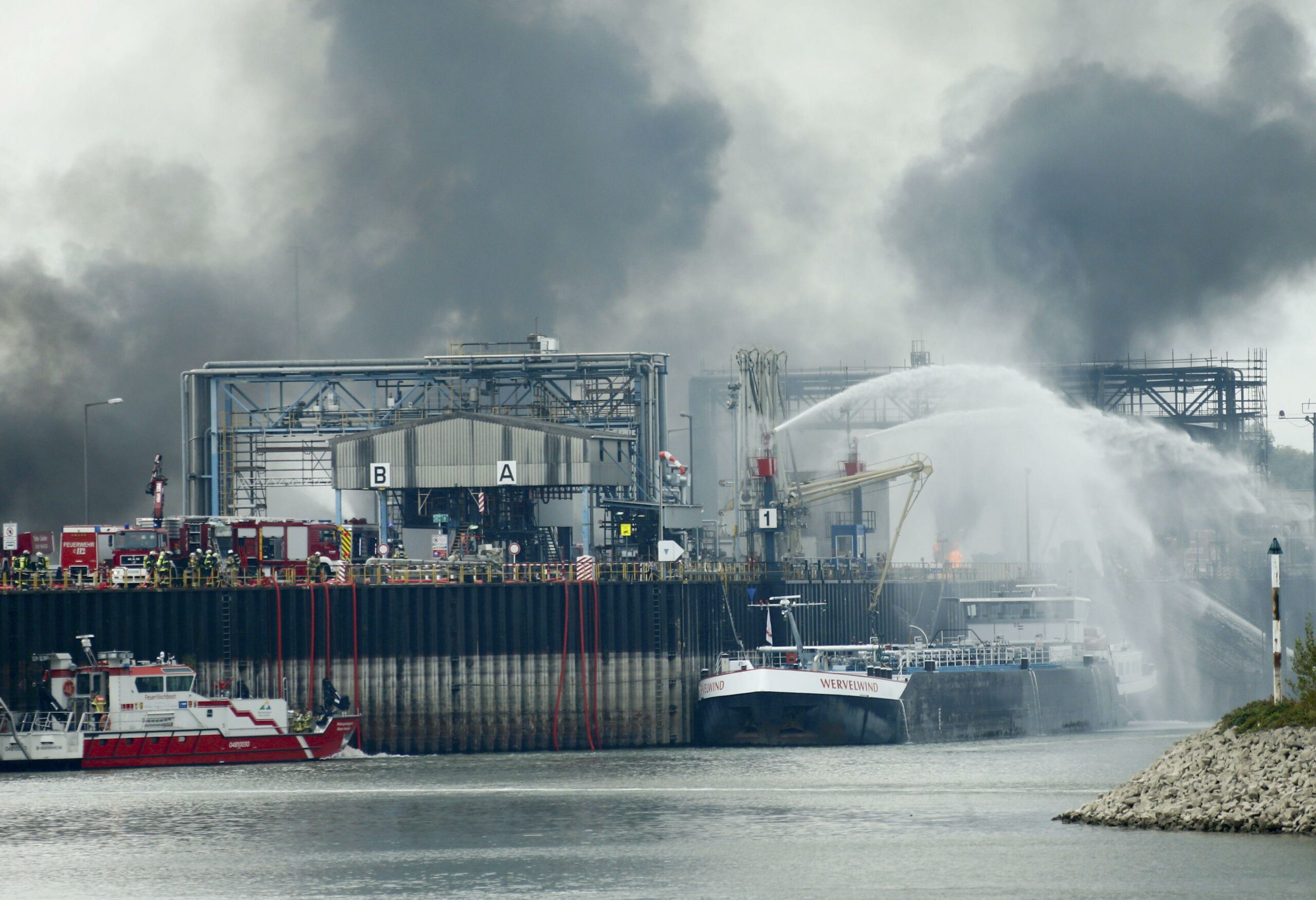 Πλάνα που μεταδόθηκαν από τοπικά ΜΜΕ δείχνουν φλόγες και μια στήλη πυκνού μαύρου καπνού να υψώνονται από το λιμάνι της εγκατάστασης, έναν τερματικό για ρευστά καύσιμα όπως ορυκτή νάφθα και μεθανόλη, που είναι σημαντικά για τον εφοδιασμό της BASF με πρώτες ύλες.