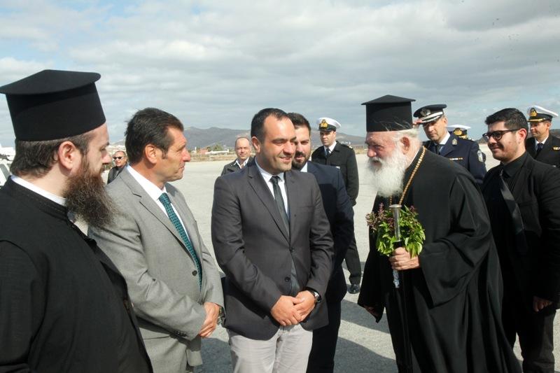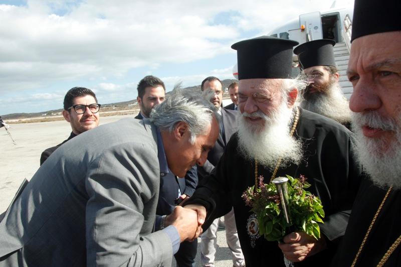 Τον Αρχιεπίσκοπο υποδέχθηκαν στο αεροδρόμιο με τη δέουσα επισημότητα ο Μητροπολίτης Σύρου και Μυκόνου κ. Δωρόθεος, ο Δήμαρχος του νησιού, εκπρόσωποι της Αστυνομίας και των Τοπικών Αρχών.