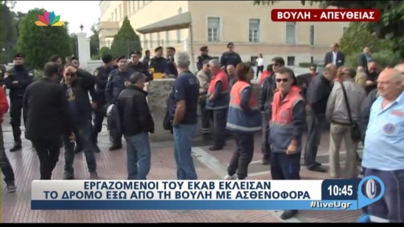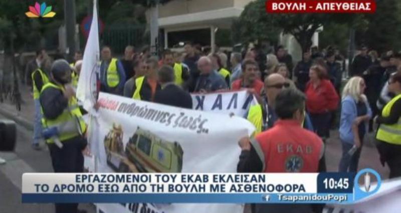 Μετά από τη γενική συνέλευση που πραγματοποίησαν οι εργαζόμενοι του ΕΚΑΒ, προχώρησαν σε κινητοποιήσεις κλείνοντας το δρόμο έξω από τη Βουλή με ασθενοφόρα.