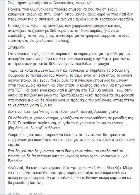 Ένα μήνυμα, το οποίο το έγραψε σε μέσο κοινωνικής δικτύωσης, μέσα απο το οποίο κατηγορεί με σφοδρή επίθεση τον Υπουργό Υγείας για το σύστημα υγείας που όπως το χαρακτηρίζει η ίδια είναι ενα «Σύστημα αποφυγής ανακοπής» θέλοντας να δείξει τις σοβαρές ελλείψεις και τα προβλήματα που υπάρχουν.