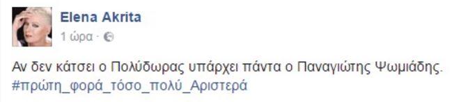 Το δικό της σχόλιο έκανε και η Έλενα Ακρίτα μέσω του προσωπικού της λογαριασμού στο Facebook: «Αν δεν κάτσει ο Πολύδωρας υπάρχει πάντα ο Παναγιώτης Ψωμιάδης. #πρώτη_φορά_τόσο_πολύ_Αριστερά».