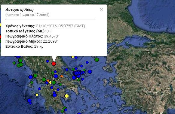 Σύμφωνα με το Γεωδυναμικό Ινστιτούτο Αθηνών ο σεισμός που σημειώθηκε λίγα λεπτά μετά τις 7 μεταξύ Λάρισας και Καρδίτσας στην περιοχή κοντά στον Παλαμά, είχε μέγεθος 3,1 Ρίχτερ και εστιακό βάθος 29 χιλιομέτρων.