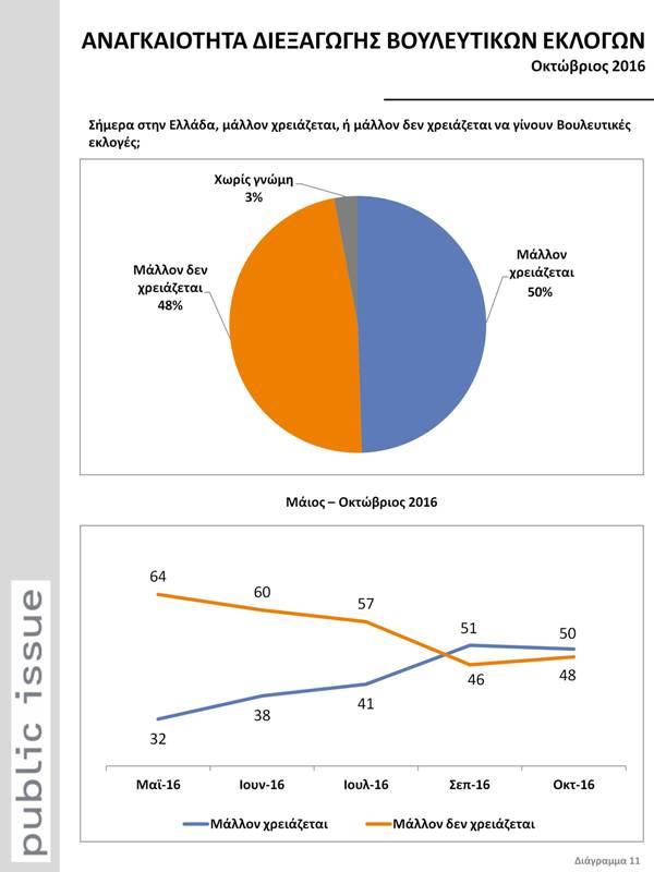 Παράλληλα, στη μέτρηση συνεχίζει να προηγείται η άποψη ότι η χώρα χρειάζεται πρόωρη προσφυγή σε κάλπες (50%), έναντι της θέσης ότι δεν χρειάζονται εκλογές (48%), αν και σε σχέση με το «Βαρόμετρο» του Σεπτεμβρίου υπάρχει μικρή μείωση της θέσης υπέρ εκλογών.