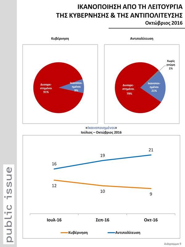 Πάντως, τόσο η κυβέρνηση όσο και η αντιπολίτευση μάλλον δεν χαίρουν της ικανοποίησης των πολιτών: το 91% δηλώνει δυσαρεστημένο από την κυβέρνηση και το 79% από την αντιπολίτευση.