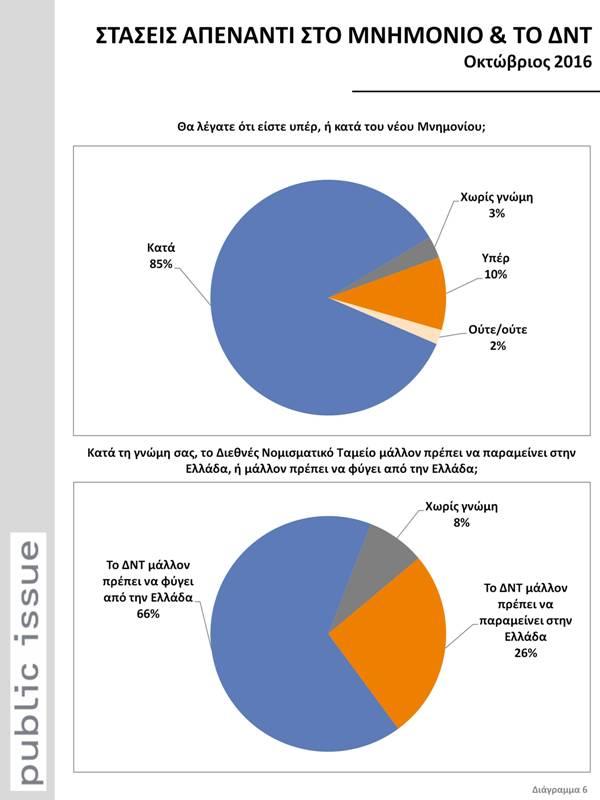Τέλος είναι σαφές ότι οι Έλληνες διαφωνούν καθέτως με τα μνημόνια (85%) και με την παρουσία του ΔΝΤ στη χώρα (66%).