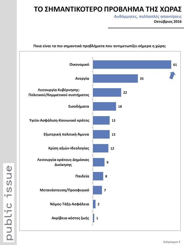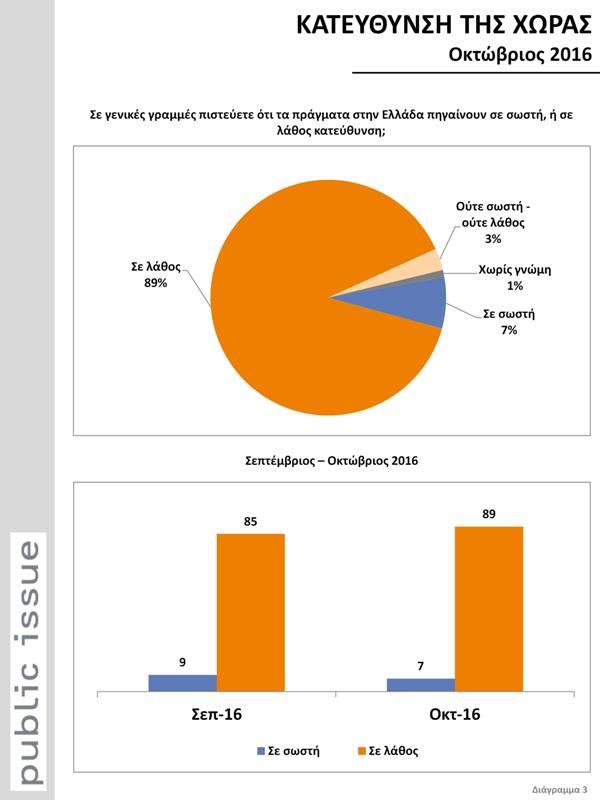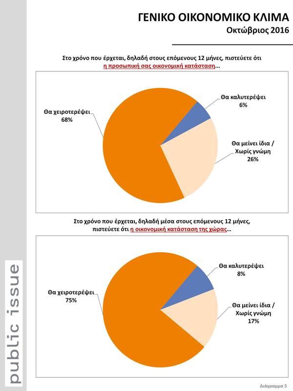 Ούτως ή άλλως, η απαισιοδοξία κυριαρχεί στις απόψεις των ερωτηθέντων, καθώς το 89% θεωρεί ότι η χώρα βαδίζει σε λάθος κατεύθυνση, το 68% πιστεύει ότι μέσα στον επόμενο χρόνο η οικονομική του κατάσταση θα επιδεινωθεί, το 75% εκτιμά ότι θα χειροτερέψει η οικονομική κατάσταση στη χώρα και το 61% θεωρεί την οικονομία ως το μεγαλύτερο πρόβλημα της χώρας με δεύτερο (με ποσοστό 35%) την ανεργία.