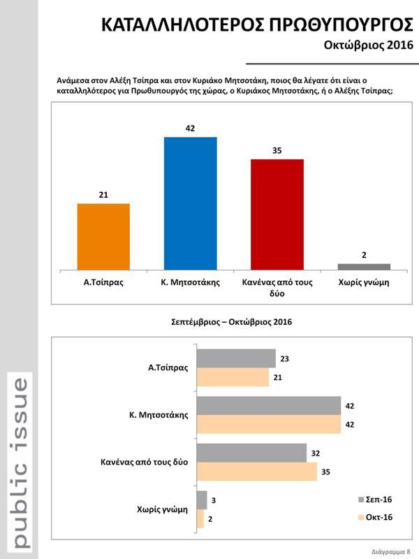 Ενδιαφέρον έχει το γεγονός ότι ο πρόεδρος της ΝΔ Κυριάκος Μητσοτάκης υπερέχει καθαρά του πρωθυπουργού Αλέξη Τσίπρα στο ερώτημα περί καταλληλότητας για την πρωθυπουργού (42% έναντι 21%, με την απάντηση «κανένας από τους δύο» να συγκεντρώνει ποσοστό 35%).