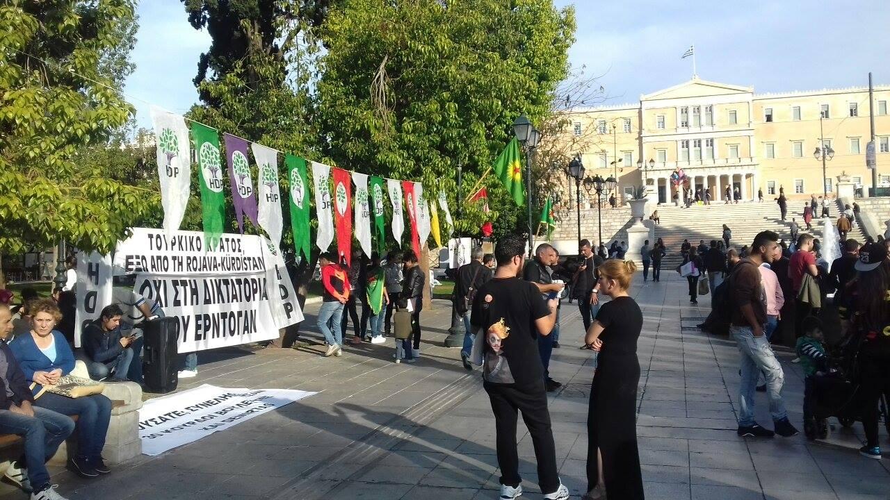 Συγκέντρωση διαμαρτυρίας για τις συλλήψεις των δύο συμπροέδρων και εννέα βουλευτών του φιλοκουρδικού Δημοκρατικού Κόμματος των Λαών στην Τουρκία πραγματοποιείται αυτή την ώρα στην πλατεία Συντάγματος, με διακριτική παρουσία της αστυνομίας.