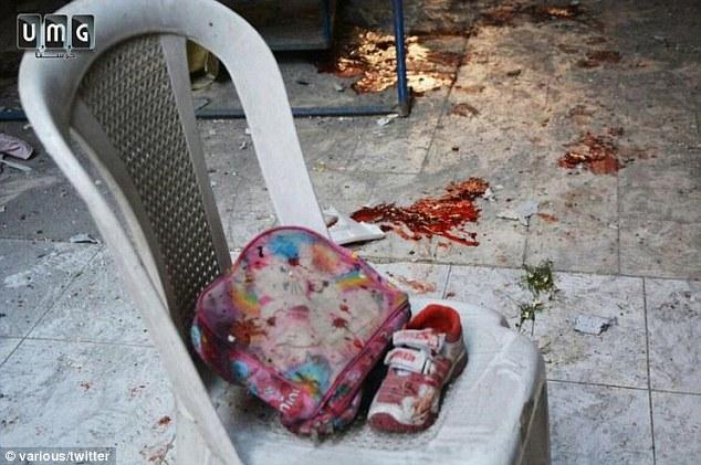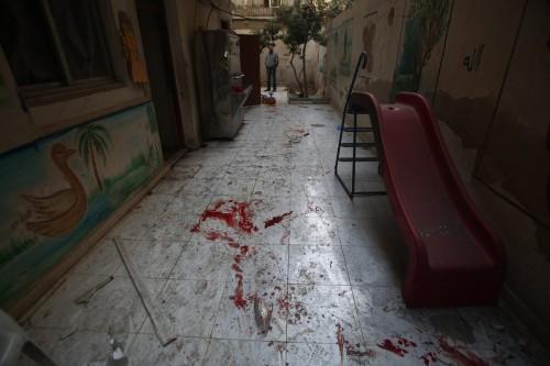 Στον βρεφονηπιακό σταθμό διακρίνονταν αίματα στο πάτωμα, δίπλα σε έναν τοίχο διακοσμημένο με τις ζωγραφιές των παιδιών.