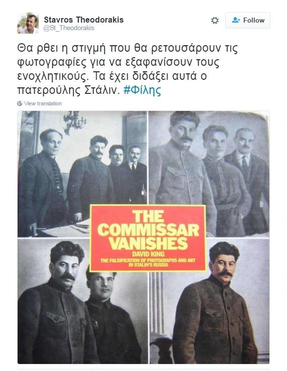 «Θα ρθει η στιγμή που θα ρετουσάρουν τις φωτογραφίες για να εξαφανίσουν τους ενοχλητικούς. Τα έχει διδάξει αυτά ο πατερούλης Στάλιν. #Φίλης»