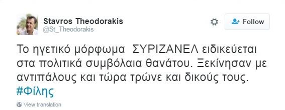 Ο επικεφαλής του Ποταμιού συμπλήρωσε ότι: «Το ηγετικό μόρφωμα  ΣΥΡΙΖΑΝΕΛ ειδικεύεται στα πολιτικά συμβόλαια θανάτου. Ξεκίνησαν με αντιπάλους και τώρα τρώνε και δικούς τους. #Φίλης».
