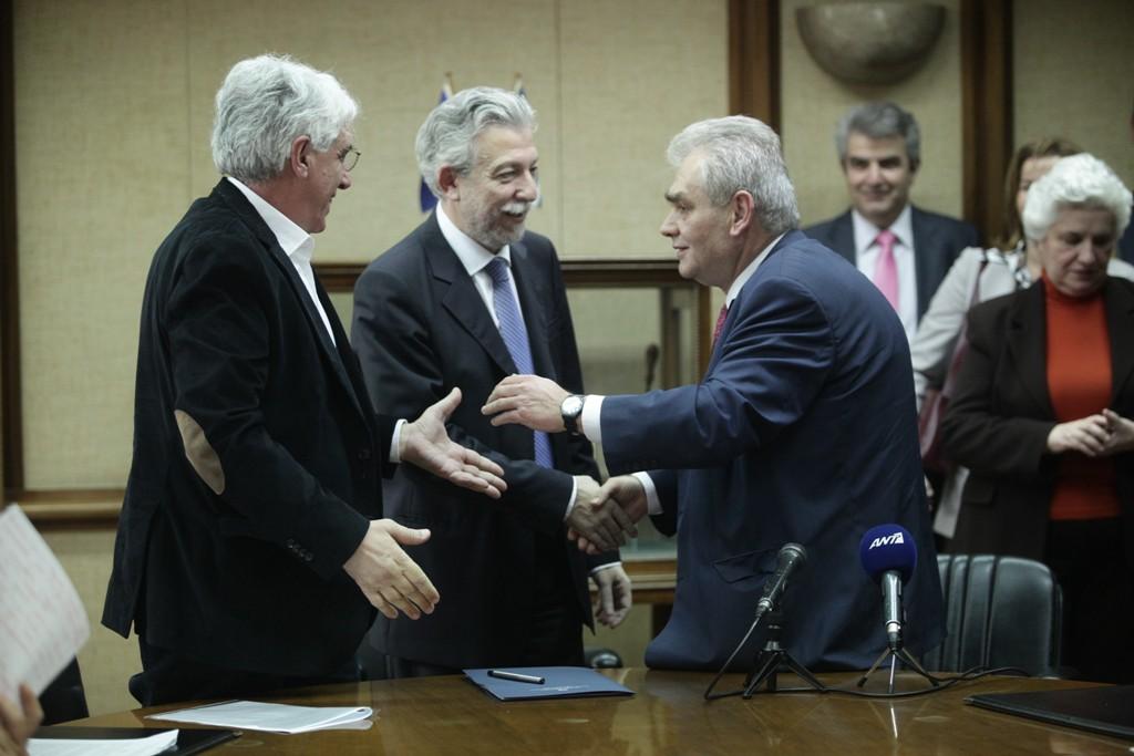 «Σου δίνουμε, κ. υπουργέ, καλή προίκα. Οκτώ νομοσχέδια και ένα στικάκι» είπε ο Παναγιώτης Κουρουμπλής, παραδίδοντας το υπουργείο Εσωτερικών στον Πάνο Σκουρλέτη.