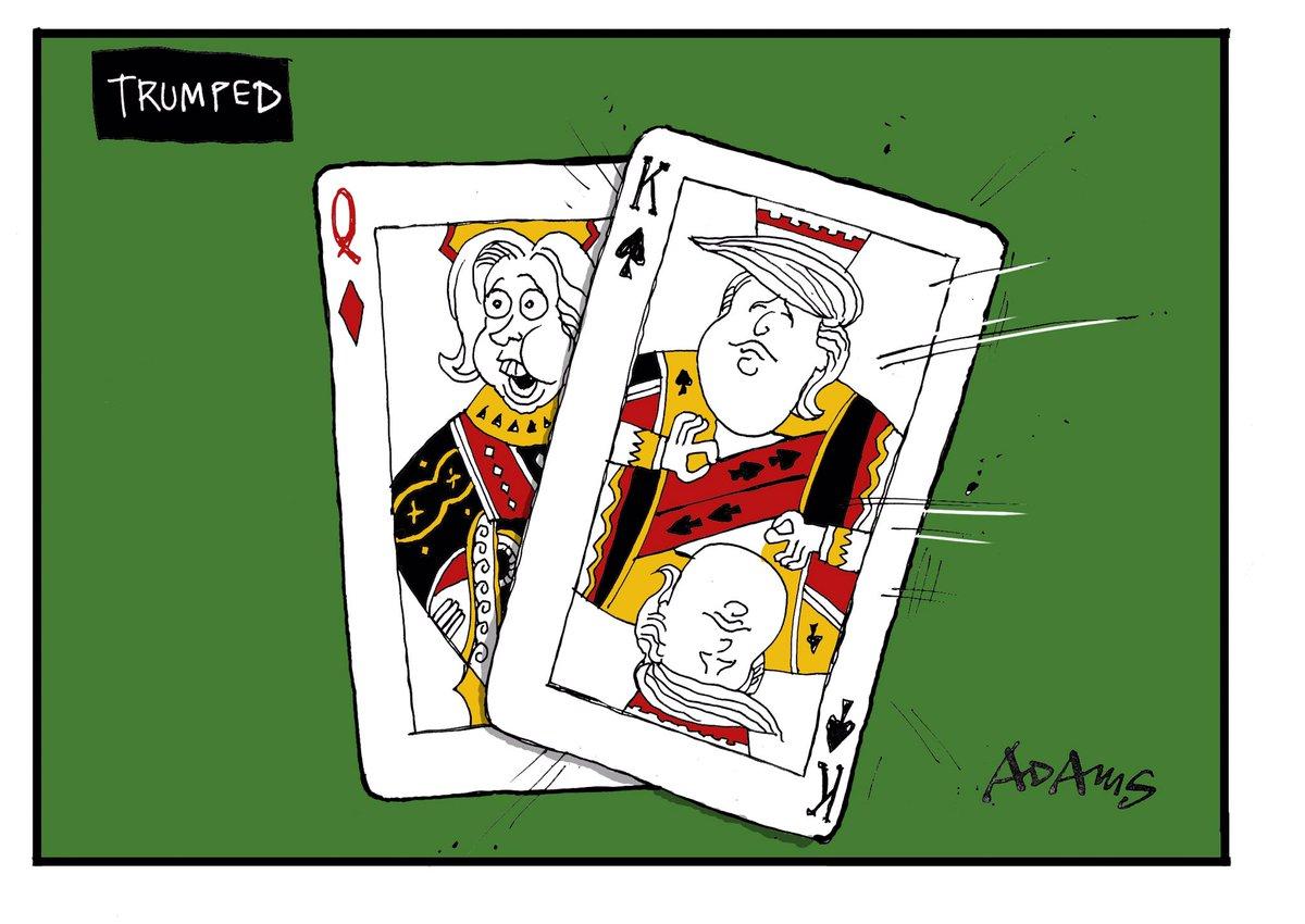Οι γελοιογράφοι αντιδρούν στην -απρόσμενη για πολλούς, όχι για όλους- επικράτησή του έναντι της Χίλαρι Κλίντον, εκλεκτής, όπως διαπιστώσαμε, της πλειονότητας των Μέσων Μαζικής Ενημέρωσης και στις δύο πλευρές του Ατλαντικού.