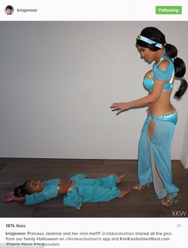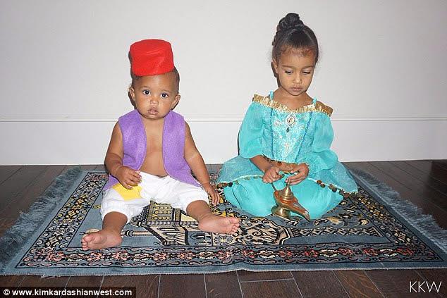 Στο πλευρό της είναι η κόρη της, Νorth και ο γιος της, Saint, που έχουν ντυθεί, μικρή Γιασμίν και μικρός Αλαντίν, αντίστοιχα.