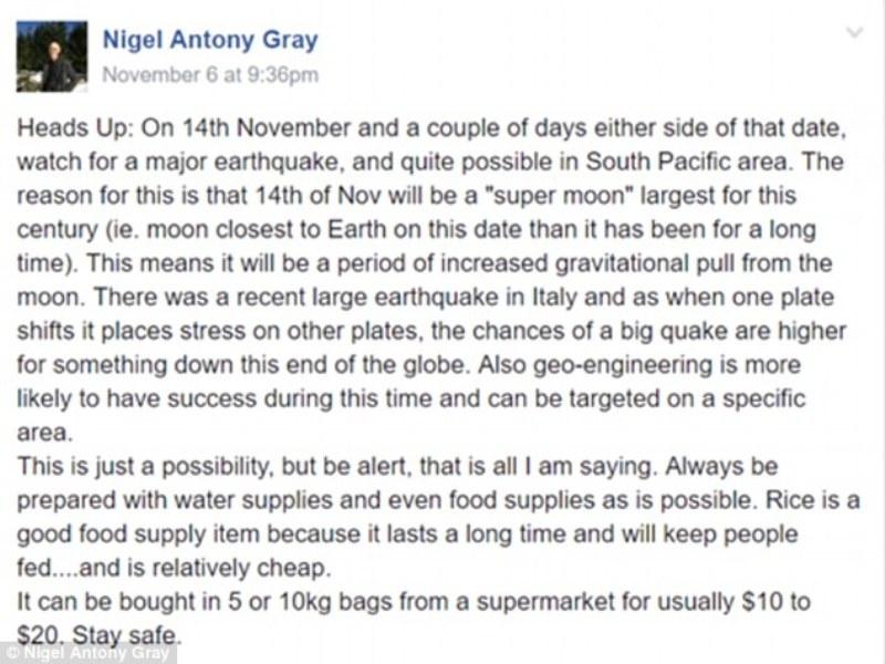 Πιο συγκεκριμένα ο Νάιτζελ Άντονυ Γκρέι είχε προειδοποιήσει μέσα από το προφίλ του στο Facebook, πως ένας ισχυρός και καταστρεπτικός σεισμός θα μπορούσε να πλήξει την χώρα τις επόμενες εβδομάδες εξαιτίας της επικείμενης υπερσελήνης.
