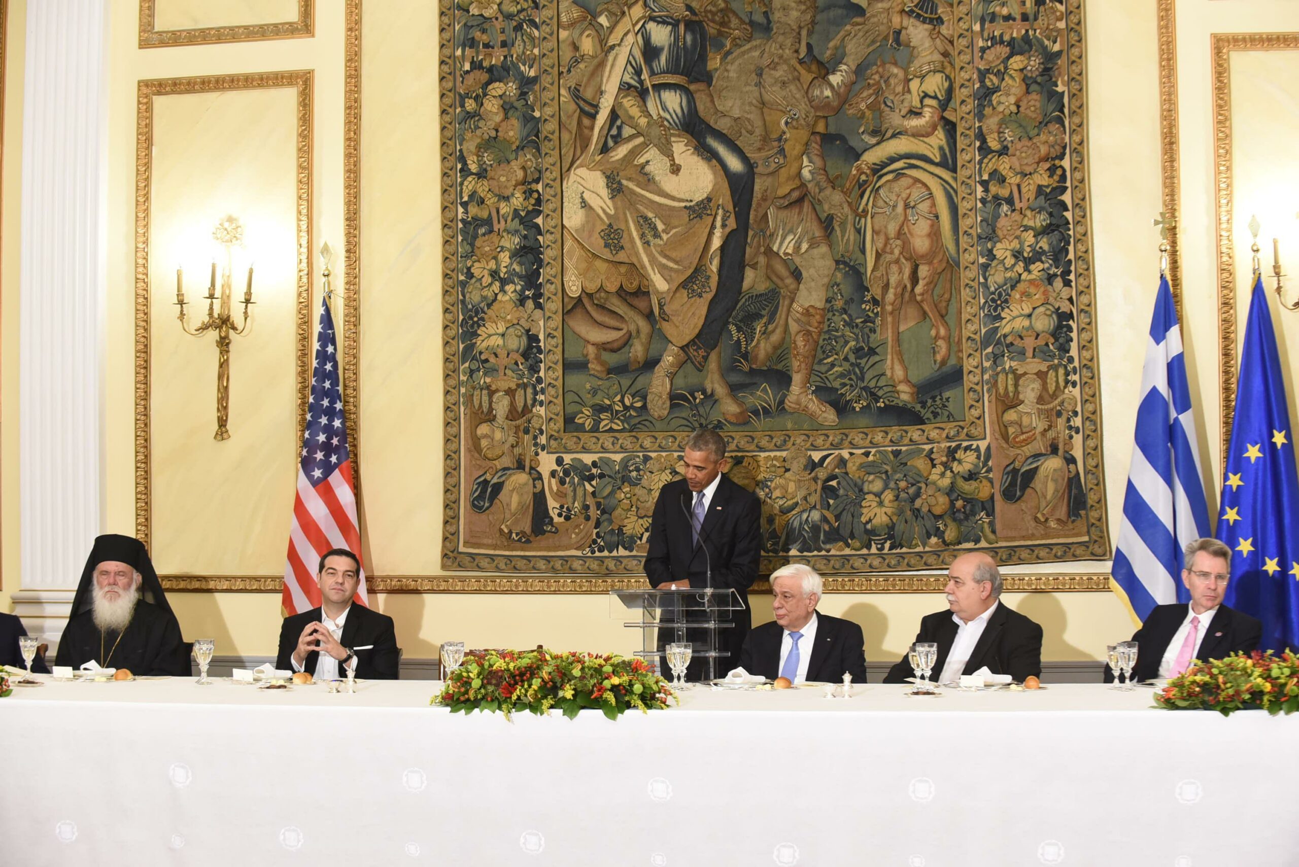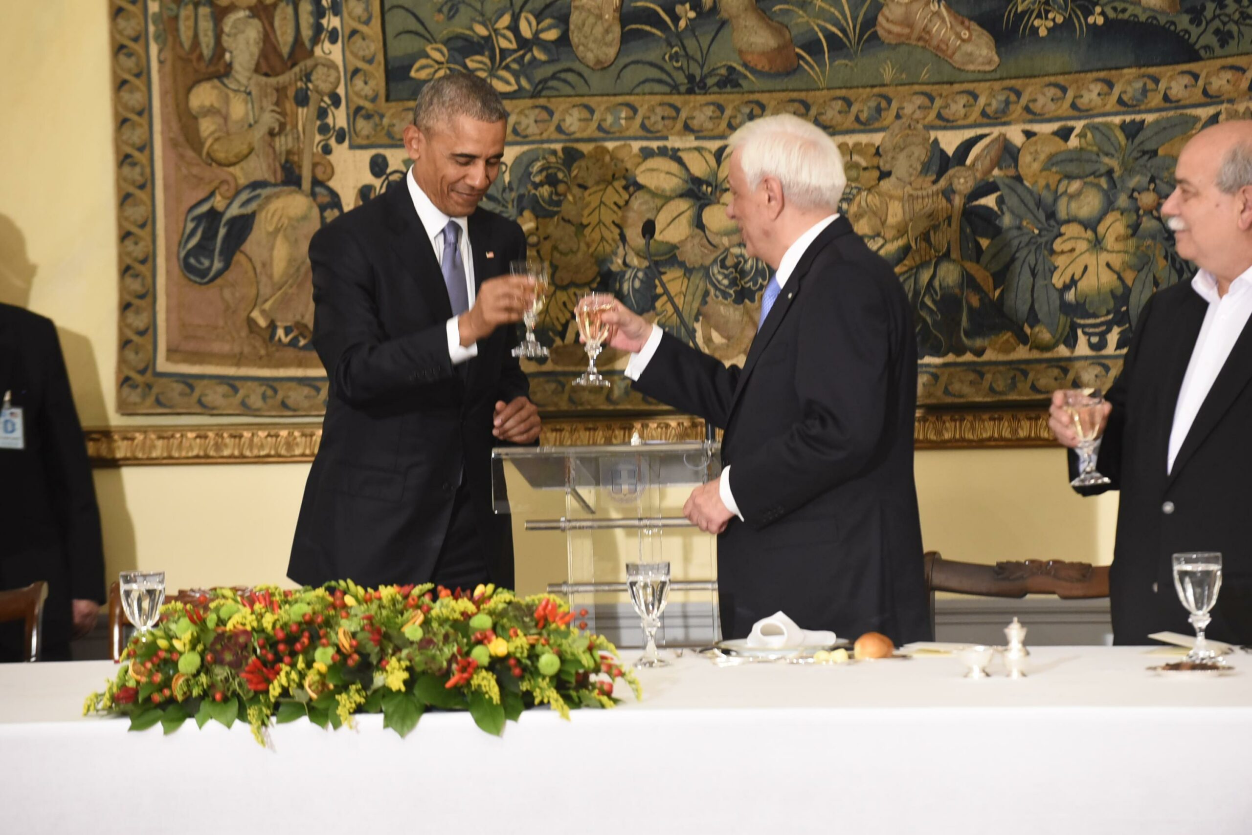 Την ικανοποίηση της Αθήνας για τις αναφορές του Μπαράκ Ομπάμα σχετικά με τη λιτότητα εξέφρασε ο Πρόεδρος Προκόπης Παυλόπουλος κατά την προσφώνησή του στο δείπνο που παρατίθεται προς τιμή του αμερικανικού Προέδρου, υπογραμμίζοντας πως η Ελλάδα «ανταποκρίνεται με αδιαπραγμάτευτη αξιοπρέπεια» στις προκλήσεις του προσφυγικού, σημειώνοντας την ανάγκη περισσότερης ευρωπαϊκής υποστήριξης.