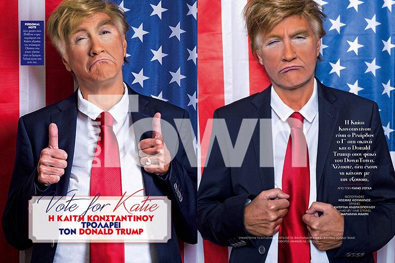 Η Καίτη Κωνσταντίνου μεταμφιέστηκε σε Ντόναλντ Τραμπ με τη βοήθεια καλού μακιγιάζ για να φωτογραφηθεί για το περιοδικό «Down Town».