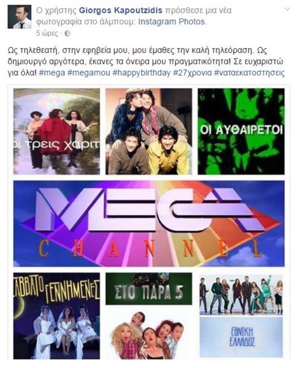 «20 Νοεμβρίου 1989 ο πρώτος ελληνικός ιδιωτικός τηλεοπτικός σταθμός, το MEGA channel ξεκινά να εκπέμπει. Αυτά είναι τα πιο δύσκολα γενέθλια για το κανάλι που μετρά 27 χρόνια. Με ένα μήνυμα του στα social media ο Γιώργος Καπουτζίδης συγκινεί και εύχεται στο κανάλι να τα εκατοστήσει, γράφοντας: «Ως τηλεθεατή, στην εφηβεία μου, μου έμαθες την καλή τηλεόραση. Ως δημιουργό αργότερα, έκανες τα όνειρα μου πραγματικότητα! Σε ευχαριστώ για όλα! #mega #megamou #happybirthday #27χρονια #ναταεκατοστησεις», έγραψε συνοδεύοντας την ανάρτησή του από φωτογραφίες των σειρών «Οι τρεις Χάριτες, Οι απαράδεκτοι, Οι Αυθαίρετοι, Σαββατογεννημένες, Στο παρά πέντε και Εθνική Ελλάδος.
