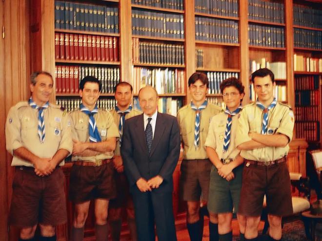 Φωτογραφία του Ιουλίου 2000: Ο ΠτΔ Κωνσταντίνος Στεφανόπουλος δέχεται στο Προεδρικό Μέγαρο αντιπροσωπεία προσκόπων του παλαιού Συστήματός του. Από αριστερά: Βίκτωρας Στιβανάκης (τότε επικεφαλής των Προσκόπων Πελοποννήσου), Θεόδωρος Δάσιος (τότε Αρχηγός του 2ου Συστήματος), Ντίνος Σπυρόπουλος (τότε Υπαρχηγός της 2ης Ομάδας Πάτρας), Γιώργος Αλανιάδης (τότε Αρχηγός της 2ης Ομάδας Πάτρας), Νικόλας Τσάκας (τότε Ενωμοτάρχης Αγριογάτων, της ενωμοτίας που ίδρυσε ο Κωνσταντίνος Στεφανόπουλος) και Δημήτρης Κουρμπανάς (τότε Ανιχνευτής της 2η Κοινότητας).