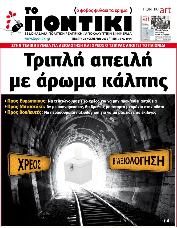 Με πρωτοσέλιδο τίτλο «Τριπλή απειλή με άρωμα κάλπης» και αναλυτικό – αποκαλυπτικό ρεπορτάζ για τις κινήσεις της κυβέρνησης σχετικά με την αξιολόγηση και το χρέος.