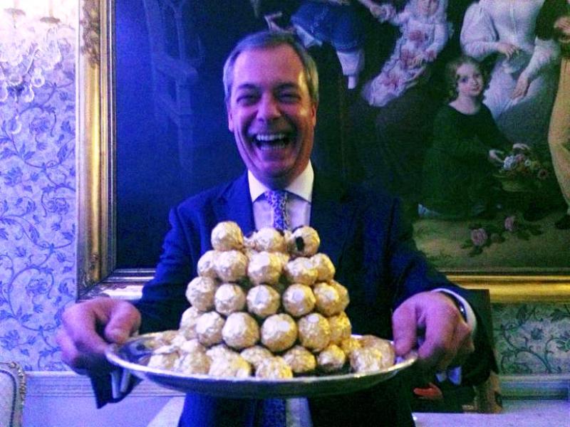 Ο ηγέτης του UKIP υποδέχθηκε τους καλεσμένους του στην εκδήλωση με… σοκολατάκια συγκεκριμένης εταιρείας, η οποία χρησιμοποιεί στις διαφημίσεις της το σλόγκαν “Κύριε Πρέσβη, μας κακομαθαίνετε” και με σαμπάνια σε μια παρωδία της διαφήμισης.