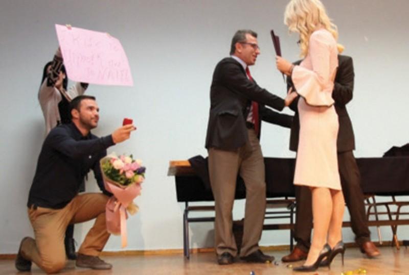 Ο νεαρός Πάρης ανέβηκε στο σημείο, όπου η Κατερίνα παρέλαβε το πτυχίο της από τους καθηγητές του τμήματος και της προσέφερε το μονόπετρο ενώ πίσω ένα ροζ πλακάτ έγραφε «Σκίσε το πτυχίο και πες το ναι».
