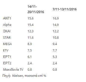 ΑΝΤ1 και Alpha διεκδικούν την κορυφή με τον ΑΝΤ1 να διατηρεί τα πρωτεία τηλεθέασης ενώ σταθερά ανεβασμένη είναι και η θεαματικότητα του ΣΚΑΙ.