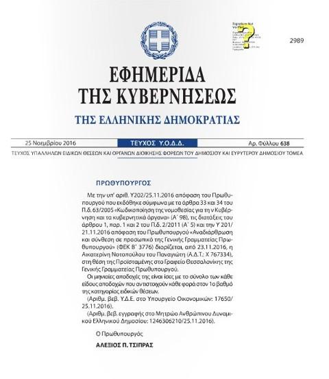 Η κα Νοτοπούλου, σύμφωνα με το ΦΕΚ διορίζεται από 23.11.2016 στη θέση της «Προϊσταμένης στο Γραφείο Θεσσαλονίκης της Γενικής Γραμματείας Πρωθυπουργού» και θα αμείβεται με τις «κάθε είδους αποδοχές που αντιστοιχούν κάθε φορά στον 1ο βαθμό της κατηγορίας ειδικών θέσεων».