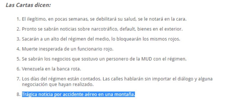 Πιο συγκεκριμένα, ο γνωστός μάντης Misterpopo Celestial είχε προβλέψει και αναρτήσει στο Twitter του πως « θα λάβουμε την τραγική είδηση για ένα αεροπορικό ατύχημα σε μια βουνοπλαγιά».Μέσα από πολλαπλές αναρτήσεις του στο Twitter είχε αναφερθεί σε μια σειρά από γεγονότα που πρόκειται να συμβούν στο άμεσο διάστημα και αν η πλειοψηφία των προβλέψεων αφορούν τη Βενεζουέλα, εντούτοις η τελευταία του προφητεία για την πτώση του αεροπλάνου.