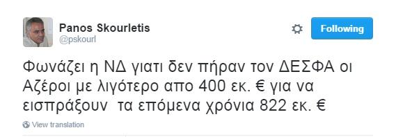 Στους Αζέρους «τα ρίχνει» ο υπουργός Εσωτερικών Πάνος Σκουρλέτης, μετά την αποτυχία πώλησης του 66% του ΔΕΣΦΑ, μέσω αναρτήσεών του στον προσωπικό του λογαριασμό στο Twitter.