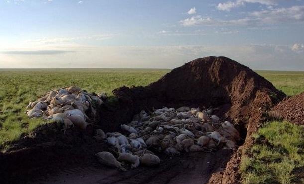 Η φωτογραφία απεικονίζει ένα μαζικό τάφο από αντιλόπες, τις οποίες έθαψαν οι αρχές του Καζακστάν προκειμένου να αποφευχθεί η μετάδοση της ασθένειας τους σε άλλα είδη ζώων, όπως αναφέρει η Mirror.