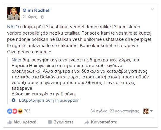 Η Μίμι Κοντέλι έγραψε στον λογαριασμό της στο Facebook: «Το ΝΑΤΟ δημιουργήθηκε για να ενώσει τις δημοκρατικές χώρες του βόρειου ημισφαιρίου απέναντι σε οποιαδήποτε απειλή. Όμως σήμερα δυσκολεύομαι να καταλάβω γιατί ο οποιοσδήποτε πολιτικός στα Βαλκάνια φορά στρατιωτική στολή και προσπαθεί να ξυπνήσει τα φαντάσματα του παρελθόντος. Έχουν παρέλθει οι εποχές των υπολοχαγών. Δώστε στην ειρήνη μία ευκαιρία».
