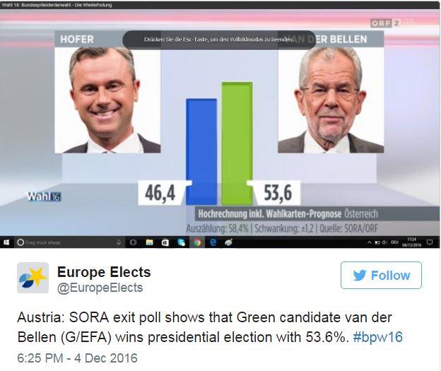 Ο 72χρονος υποστηριζόμενος από τους Πράσινους πρώην αρχηγός τους, ο καθηγητής Πανεπιστημίου, Αλεξάντερ Βαν ντερ Μπέλεν είναι ο νικητής του σημερινού επαναληπτικού γύρου των αυστριακών προεδρικών εκλογών, και ως εκ τούτου ο νέος ομοσπονδιακός Πρόεδρος της Αυστρίας, έχοντας επικρατήσει του ακροδεξιού υποψήφιου Νόρμπερτ Χόφερ, υπαρχηγού του ακροδεξιού εθνικιστικού Κόμματος των Ελευθέρων.