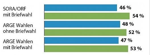 Στο πρώτο exit poll της κρατικής τηλεόρασης της Αυστρίας αναφέρονται τα ποσοστά των δυο υποψηφίων (54-54%), στο δεύτερο από εταιρεία δημοσκοπήσεων τα ποσοστά δίχως να περιλαμβάνονται οι επιστολικές ψήφοι και στο τρίτο με τις επιστολικές ψήφους που είναι 700.000 και η καταμέτρησή τους θα ξεκινήσει το πρωί της Δευτέρας.,