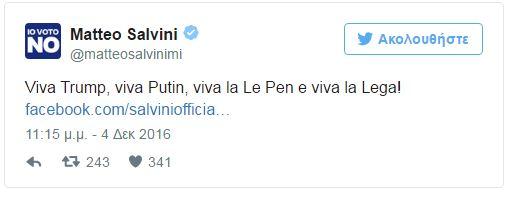 “Ζήτω ο Τραμπ, Ζήτω ο Πούτιν, Ζήτω η Λε Πεν και ζήτω η Λέγκα”, έγραψε στον λογαριασμό του στο Twitter.