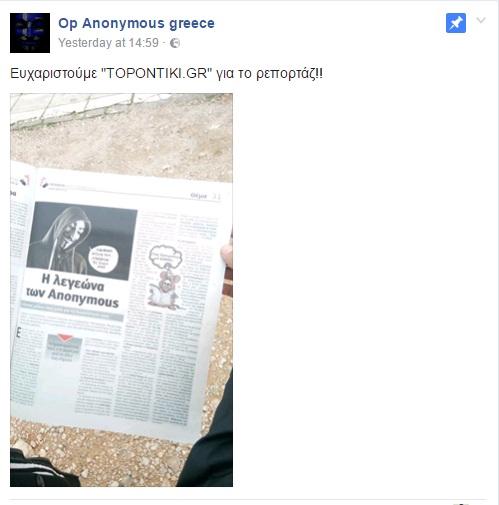 Το ρεπορτάζ που δημοσιεύθηκε στην εφημερίδα «Το Ποντίκι» για την λεγεώνα των Anonymous ανήρτησαν στην σελίδα τους στο Facebook, μέλη των Anonymoys στην Ελλάδα.