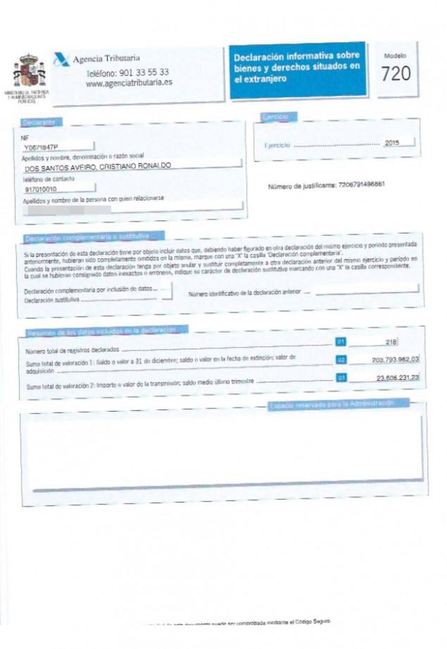 Το έγγραφο αποδεικνύει πως ο Ρονάλντο δήλωσε εισοδήματα 23,5 εκατ. ευρω εντός Ισπανίας και άλλα 203,7 εκατ. ευρώ, που τα κέρδισε από δραστηριότητες εκτός. Πρόσφατα πάντως, ο άσος της Ρεάλ κατηγορήθηκε ότι απέκρυψε 150 εκατ. ευρώ μέσω των Παρθένων Νήσων.