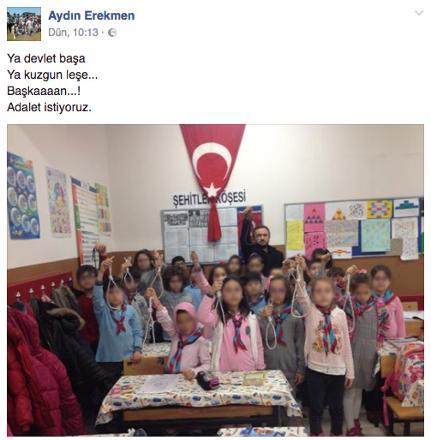Ο δάσκαλος, ο οποίος ονομάζεται Αϊντίν Ερεκμέν, ανήρτησε, μάλιστα, τη φωτογραφία στον λογαριασμό του στο Twitter. Μόλις η φωτογραφία άρχισε να κάνει τον γύρο του διαδικτύου, προκαλώντας αποστροφή, ο Ερεκμέν ισχυρίστηκε ότι προέβη σε αυτή την κίνηση για να ζητήσει δικαιοσύνη για τις επιθέσεις στην Κωνσταντινούπολη και στη συνέχεια έσβησε το λογαριασμό του.