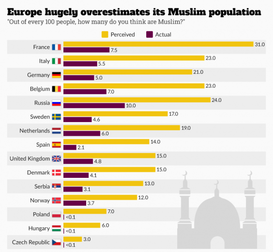Στη Γαλλία πιστεύουν ότι το 31% είναι μουσουλμάνοι, ενώ το πραγματικό ποσοστό του πληθυσμού είναι μόλις 7,5%. Στην Ιταλία θεωρούν ότι οι μουσουλμάνοι φθάνουν το 23% του πληθυσμού. Είναι μόλις 5,5%. Στη Γερμανία πιστεύουν ότι ένας στους πέντε είναι μουσουλμάνος, ενώ στην πραγματικότητα το ποσοστό είναι μόνο 5%.
