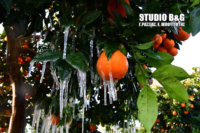 Σε αυτή την περίπτωση οι εικόνες είναι ακόμα πιο εντυπωσιακές με παγωμένους κρυστάλλους να έχουν δημιουργηθεί στις καλλιέργειες των εσπεριδοειδών.