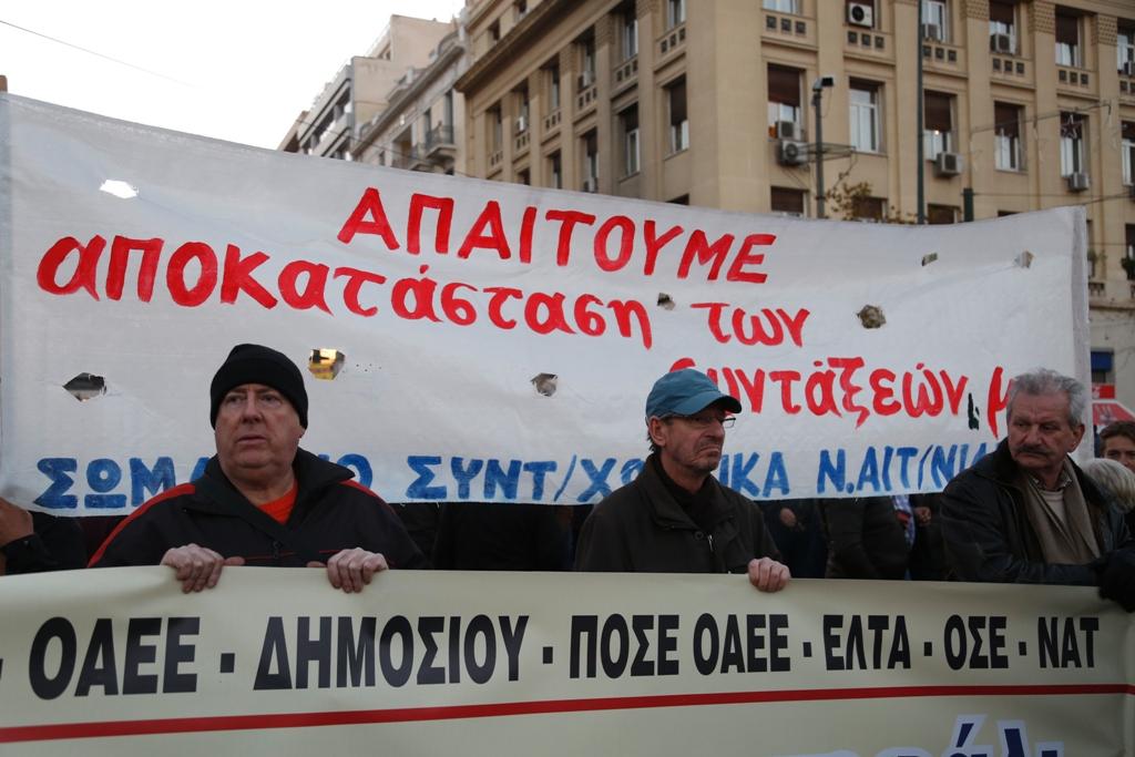 Στο Μέγαρο Μαξίμου κατέληξε πριν από λίγο η πορεία που ακολούθησε το Πανελλαδικό συλλαλητήριο των οργανώσεων συνταξιούχων από όλη την Ελλάδα (ΙΚΑ, ΟΑΕΕ, Δημοσίου, ΕΛΤΑ, ΝΑΤ, ΟΣΕ, ΠΟΣΕ-ΟΑΕΕ) το οποίο πραγματοποιήθηκε το απόγευμα της Πέμπτης στα Προπύλαια, διεκδικώντας στο ακέραιο ό, τι τούς έχει αφαιρεθεί από τις περικοπές που έχουν υποστεί οι συντάξεις τους. Κεντρικό σύνθημα των συνταξιούχων είναι ότι «δεν σκύβουν το κεφάλι» και δεν δέχονται τον «εμπαιγμό με ψίχουλα που πάνε να μοιράσουν σε σχέση με αυτά που τους έχουν πάρει».