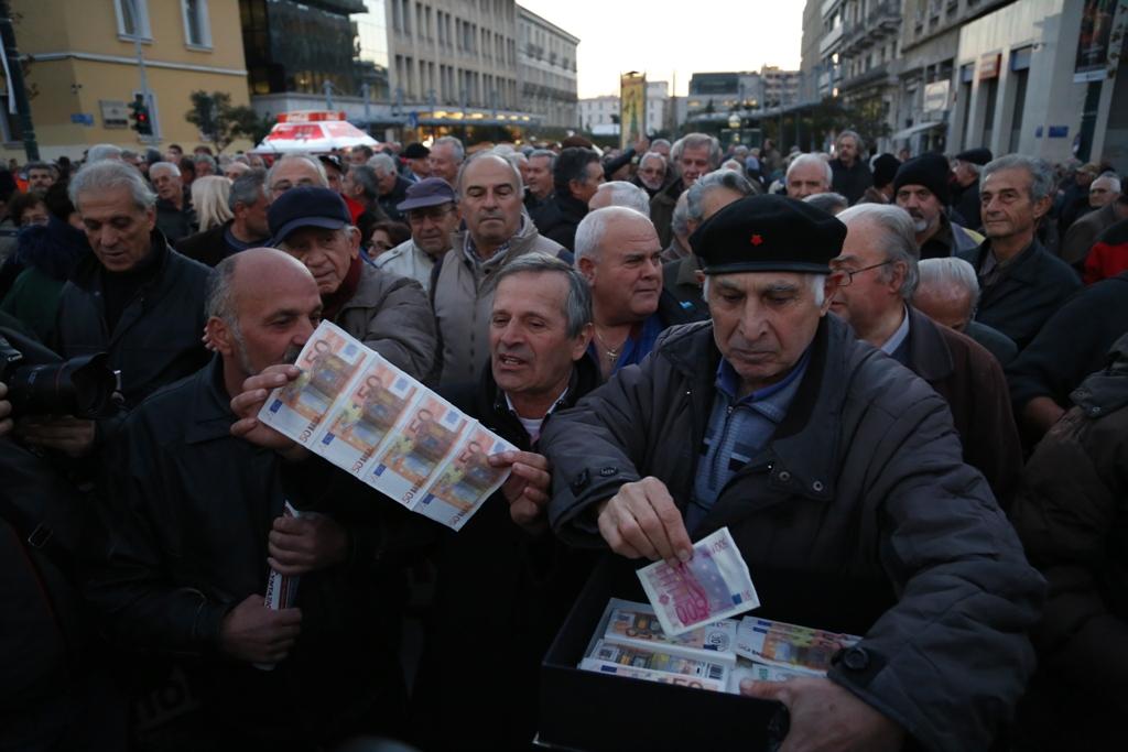 Ένας από τους συνταξιούχους μοίρασε στους διαδηλωτές ψεύτικα χαρτονομίσματα του ευρώ, τα οποία χρησιμοποίησαν για να εκφράσουν την απογοήτευσή τους και την θλίψη τους για το ζήτημα των περικοπών των συντάξεων.