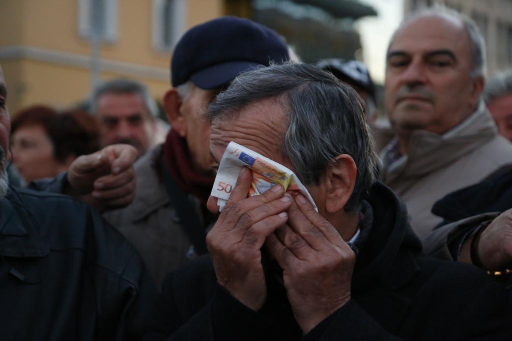 Μάλιστα, ένας συνταξιούχος σκουπίζει τα “δάκρυά” του με το ψεύτικο χαρτονόμισμα.