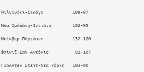 Σε αγώνες για το ΝΒΑ σημειώθηκαν τα εξής αποτελέσματα: