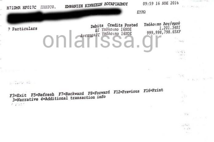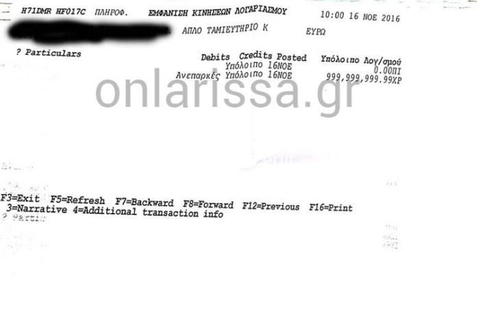 Το απίθανο περιστατικό συνέβη προ περίπου ενός μηνός, σε υποκατάστημα μεγάλης ελληνικής τράπεζας στη Λάρισα, εκεί όπου είχε μεταβεί ο επιχειρηματίας για να πραγματοποιήσει ενημέρωση σε συνολικά έξι εταιρικούς λογαριασμούς.